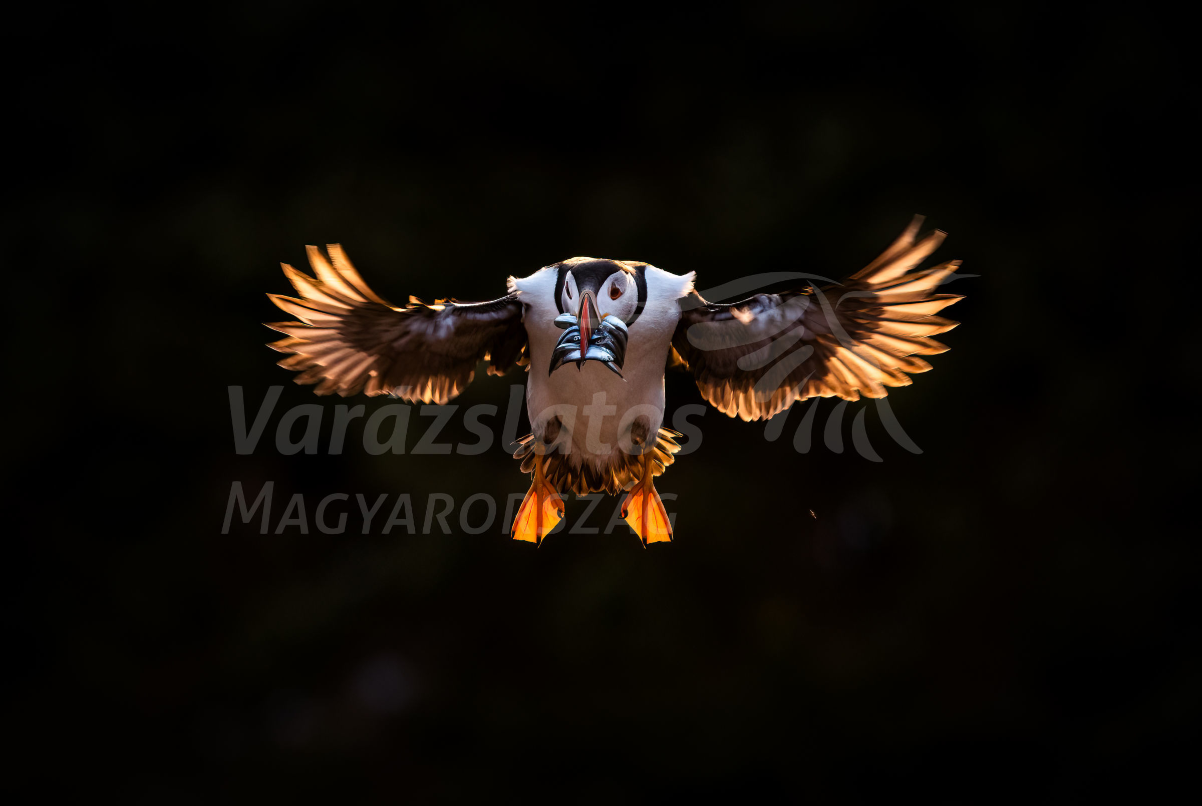 Egy lunda lebeg a mélyfekete háttér előtt, csőre tele ezüstös homoki angolnákkal. A madár kinyújtott szárnyait átvilágítja a lenyugvó nap narancssárga fénye, így rajzolva tökéletes kontúrt a tengeri madár szárnytollainak.