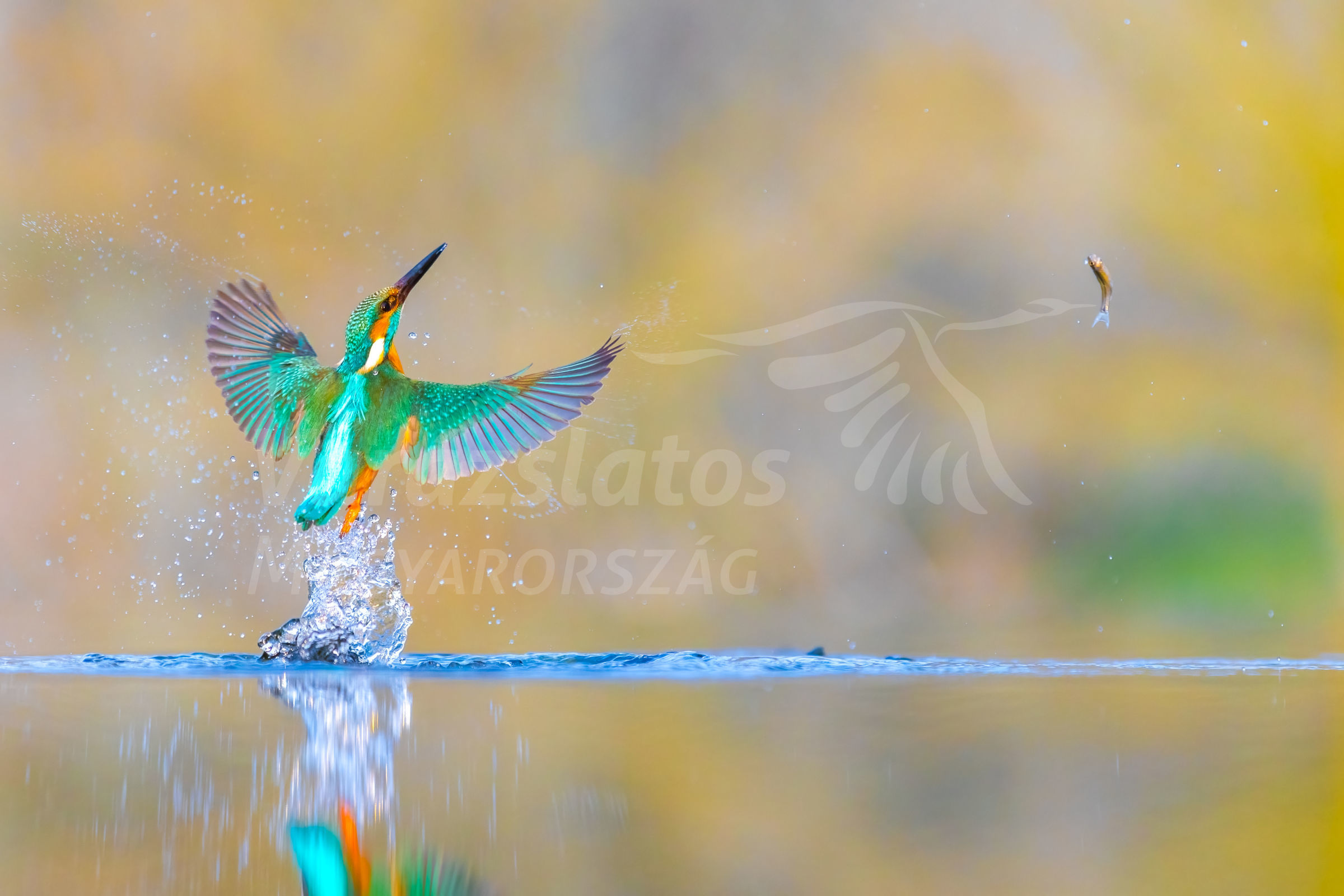 Amint a jégmadár kiemelkedett a vízből a csőréből kiesett hal nagy ívben repült vissza a vízbe .