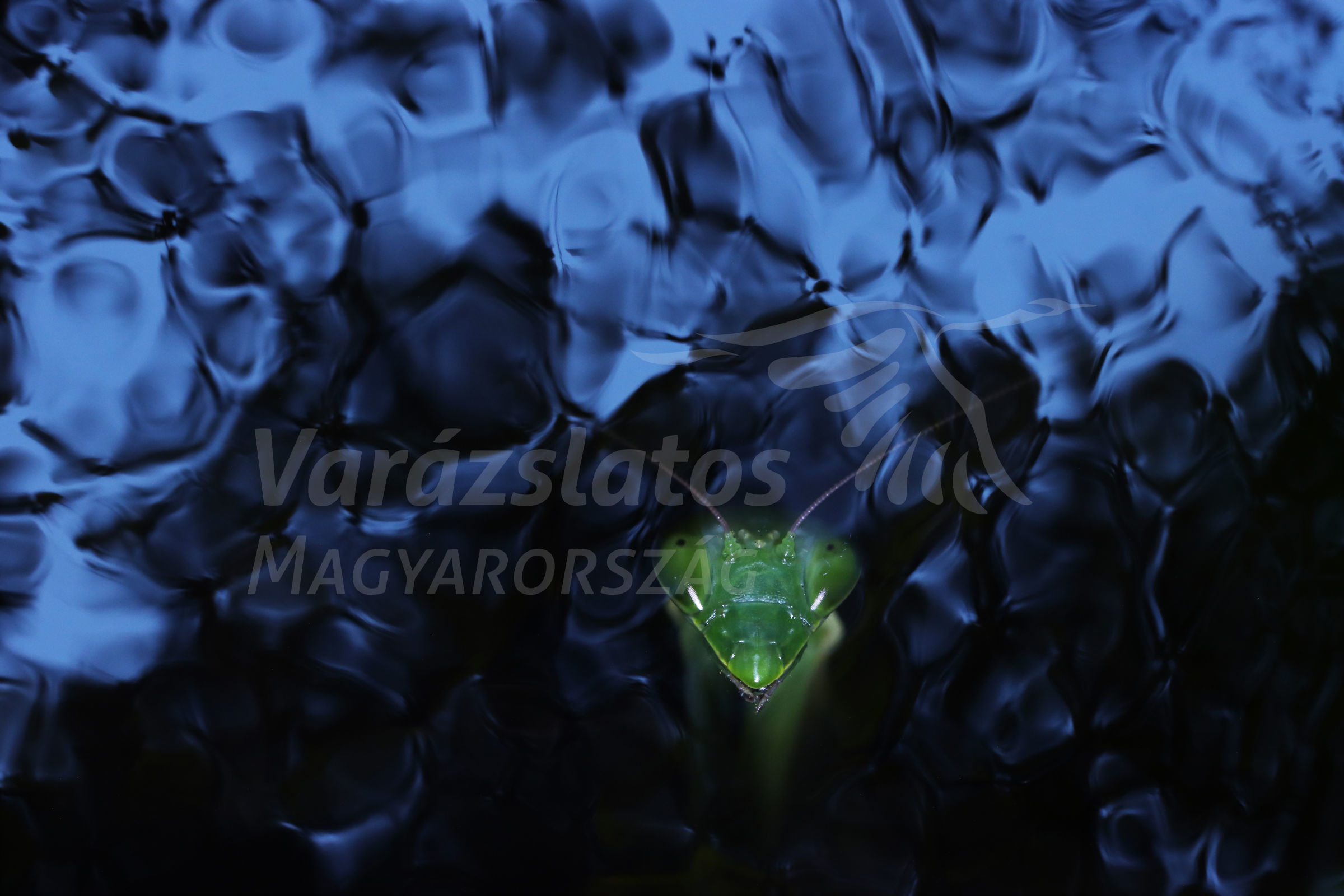 Ezt a képet egy imádkozó sáskáról készítettem a Duna-Ipoly Nemzeti Parkban. Az esti fotózásom során találtam ezt az imádkozó sáskát. Sokat kísérleteztem a fotózásával, mert az ijesztő megjelenése miatt egy víziszörnyet szerettem volna létrehozni. Ezért a szemből lefotózott állatot a mellettem lévő fodrozódó patakra fotóztam. A kép kamerán belüli multiexpozíciós technikával készült.