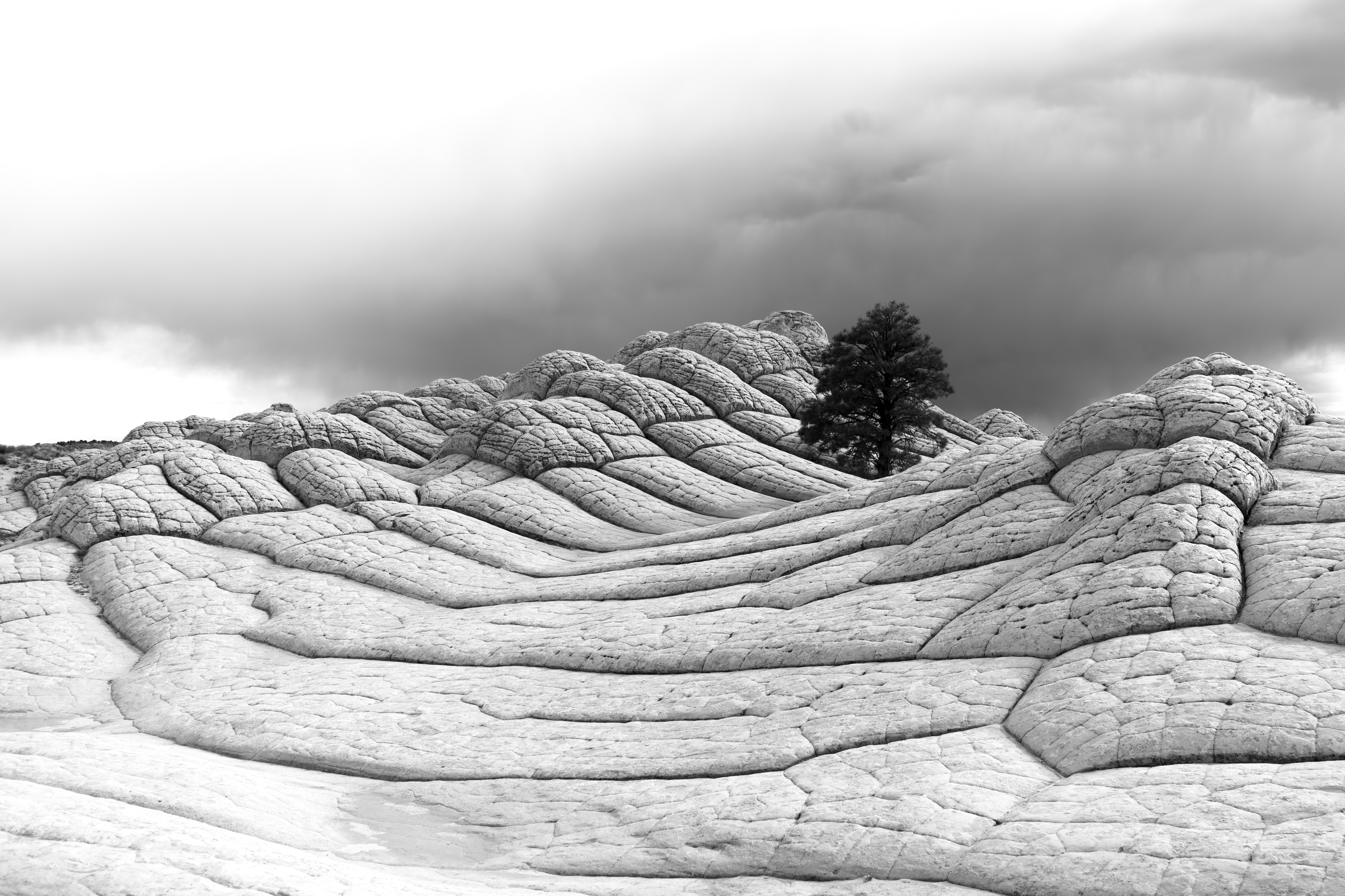 Idén májusban egy Arizona és Utah államokat felölelő úton látogattam el az Arizona és Utah államok határán lévő Vermilion Cliffs National Monumenthez. Döbbenetes formák és színek jellemzik a környéket, jellemzően vörös sziklákkal. Ez a kis rész azonban fehéren magasodott, a tetején egy magányos fenyő állt.