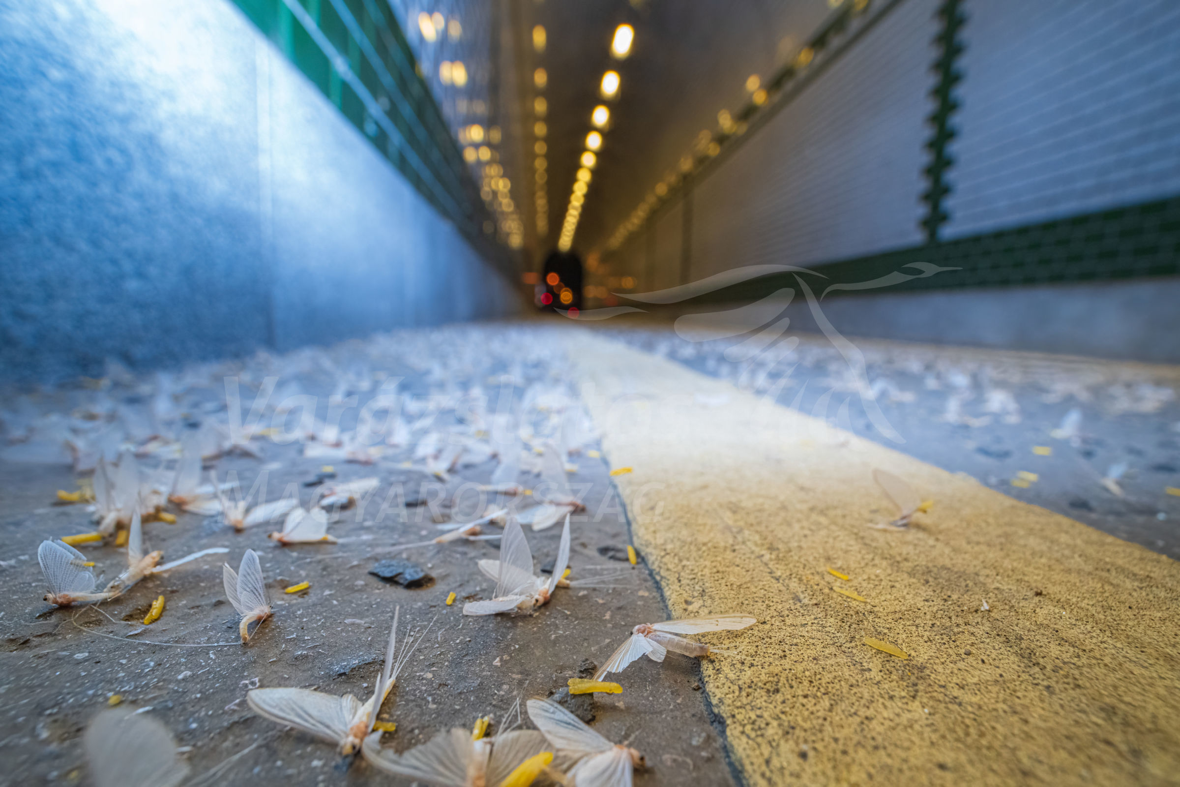 A dunavirágok alkonyatkor kezdenek repülni a Duna felett, ha nem lenne világítás talán nem is látnánk őket. Világítás azonban van, mely vonzza őket, így a folyótól eltávolodva a lámpák csapdájába esve vergődnek, és nem tudják beteljesíteni életük utolsó célját, a szaporodást, hiszen a megtermékenyített nőstények petecsomóikkal a parton, aszfalton, hídon, aluljáróban pusztulnak el ahelyett, hogy a Dunába kerülnének. A kép a Margit híd kerékpár alagútjánál készült.