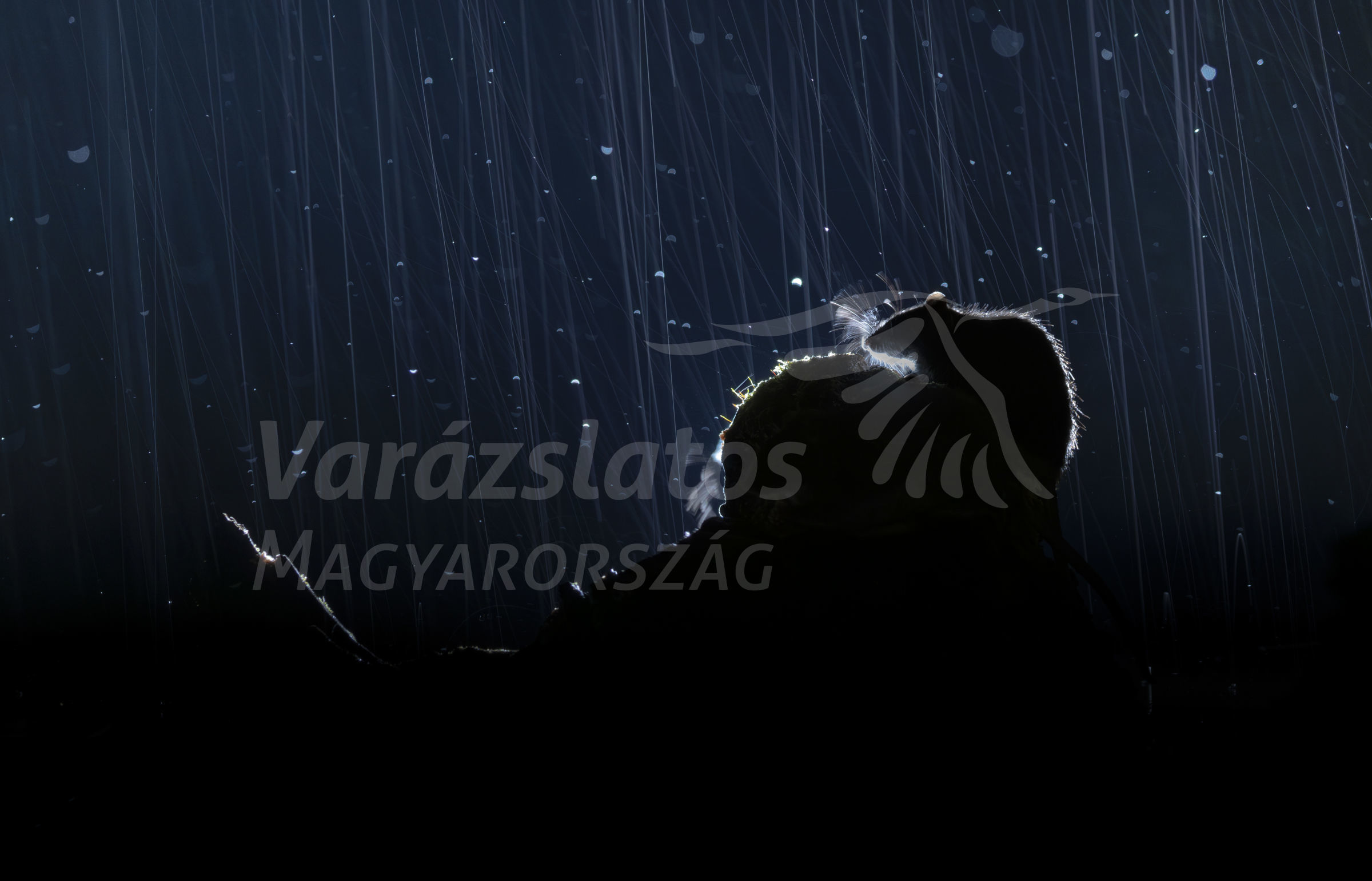 Egy vándorpatkány sziluettje látható a képen, amint a szakadó esőben egy farönk tetején ül. Több tucat estét kint töltöttem hogy az elképzelt kép megvalósuljon. És azt vettem észre hogy igazán akkor jó a fotó ha a szakadó esőben fotózom a patkányt. 0,5 másodperces záridőt választottam, így jól érzékelhető az esőzés dinamikája. A háttérben egy vaku , és egy led panelt helyeztem el hogy a helyes fények megvalósuljanak.