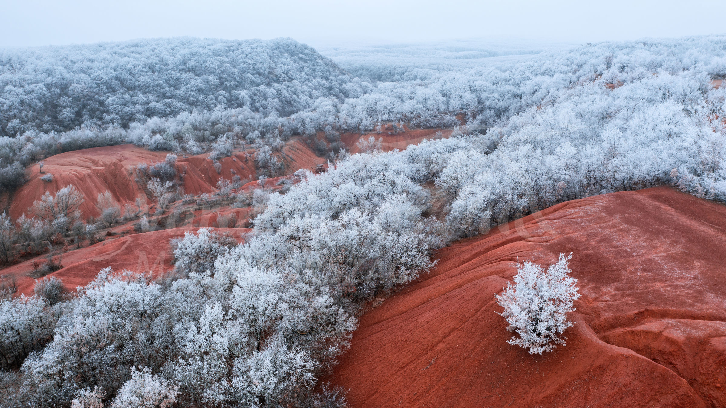 Egyik kedvelt fotós helyszínem a felhagyott gánti bánya környéke, ahol csodás komplementer-képeket lehet készíteni, akár a természet és az emberi tevékenység, akár a vörös és a zöld kontrasztjára gondolunk. A tél beköszöntével jutott eszembe, milyen izgalmas lehet az a vidék akkor, ha zúzmarás a táj. Már nem is volt más dolgom, mint várni a megfelelő időjárást, amikor a hidegpárna hatására fehérbe borulnak a fák és a cserjék.