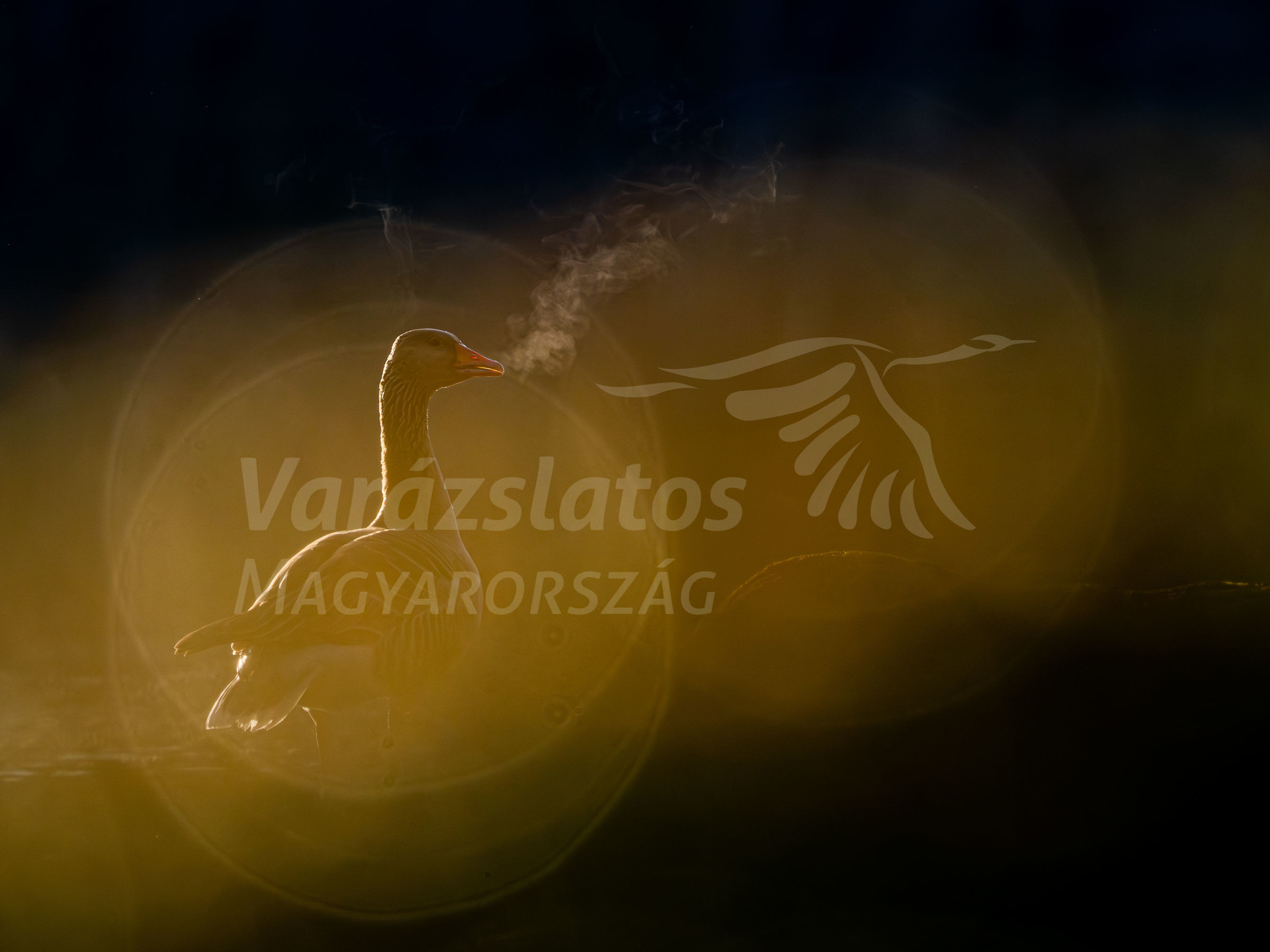 A nyári lúd a tóba nyúló kidőlt fán végezte tollászkodását a hideg tavaszi reggelen. Miután végzett, folyamatos kommunikációban volt a környezetével. A képet kézből a partról készítettem, a parton lévő harmatos fűszálakon keresztül.