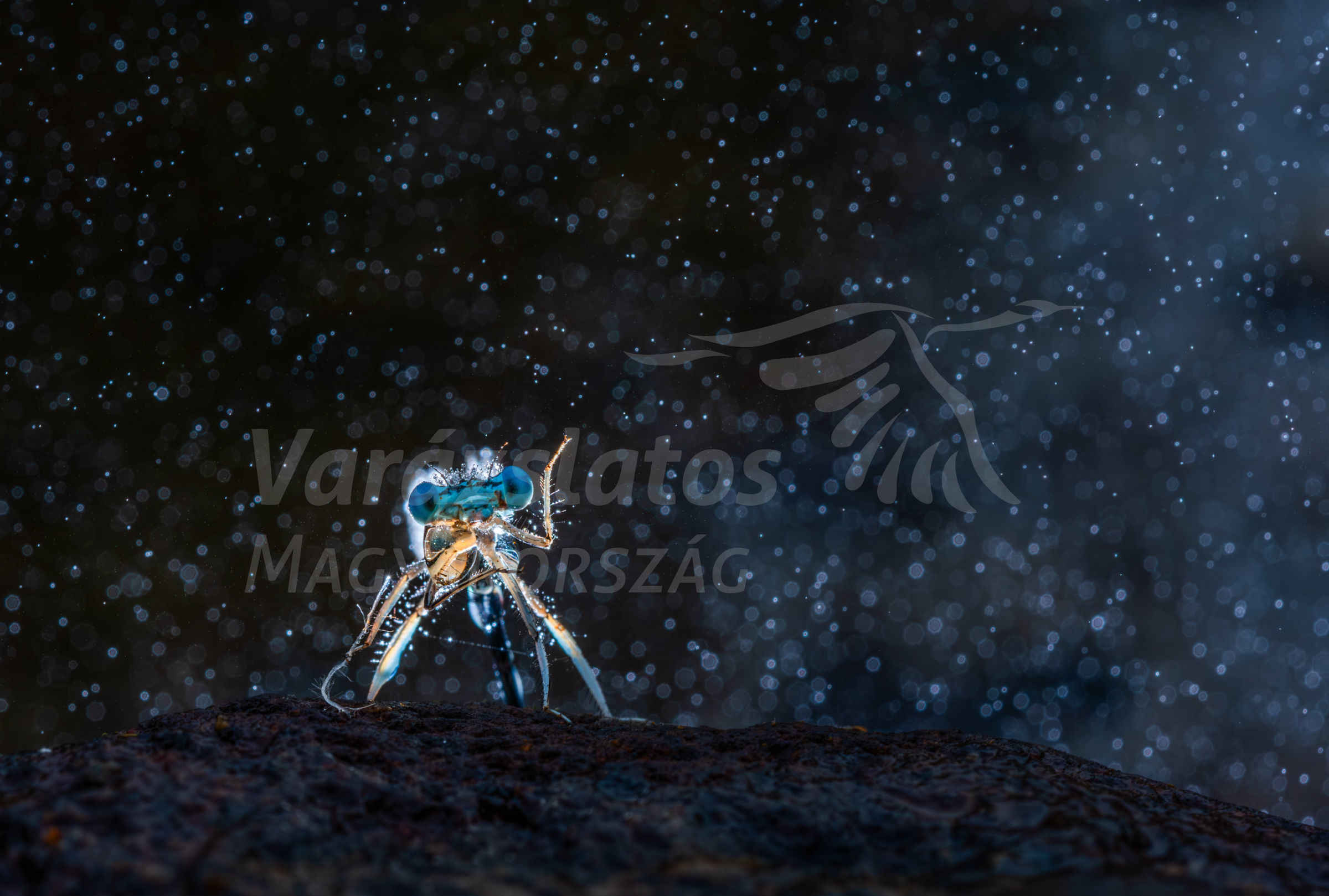 A Borzont-patakban (Románia, Hargita megye) rengeteg szitakötő lógott és pihent a fűszálakon aznap a hajnali órkában. Gumicsizmában beleléptem a patakba, és kerestem a megfelelő témát, amikor hirtelen megláttam egy szitakötőt (Ischnura elegans), amely a kövön mászott és készült a hajnal fogadására. Ez az a pillanat, amikor karjaival letörli a harmatcseppet, és egy idő után szárnyra kel. Valószínűleg ez a példány már próbált repülni és a köveken landolt, mert a szitakötők ritkán szoktak köveken pihenni, inkább a fűszálakat részesítik előnyben. Hasra feküdtem, és éles szögből fényképeztem. A vakut a háttérbe rejtettem. Pára és köd volt, és úgy gondoltam, hogy ellenfényt használok, hogy a köd is látszódjon a felvételen. Így sikerült csillagfényes hangulatot varázsolnom.