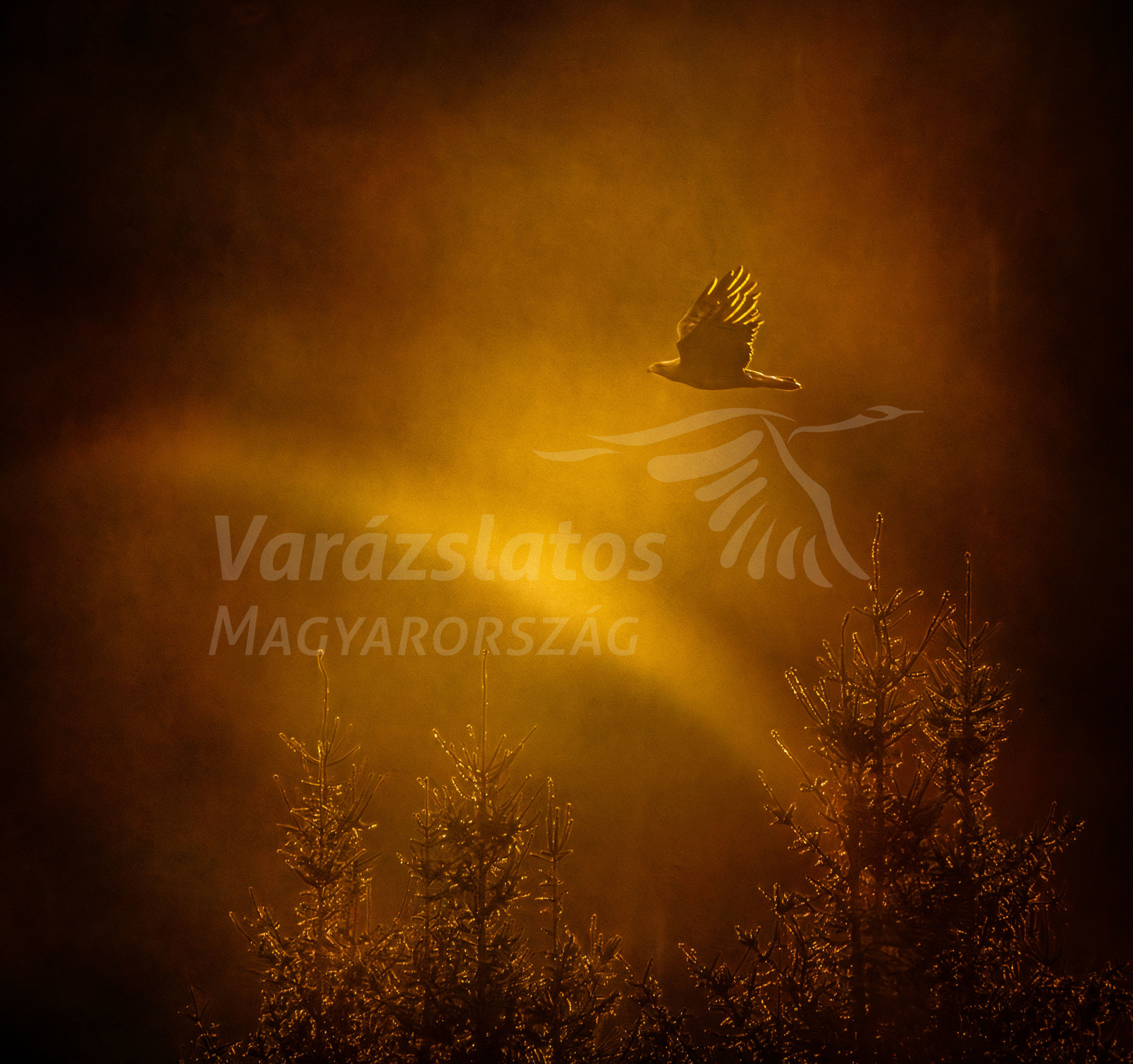 Szarvasbőgésről tartottunk hazafelé, amikor a távolban megpillantottunk egy hatalmas madarat legalább 2 méteres szárnyfesztávolsággal suhant a fenyők között és felett a gyergyói erdőszélen. Gyorsan rámozdítottam a gépet, időközben eltünt a magasabban álló fenyők közt és próbáltam lekövetni az útját, úgy hogy majdnem semmit nem láttam, egyrészt az előttem álló fák és ágak miatt másrészt pedig a nap végig a szemembe világított, így csak érzésből tudtam, hogy körülbelül hol repülhet a Szirti sas. Nagyon örültem, hogy amikor visszanéztem a képet és feldolgozásra került, akkor maradt benne annyi infmáció, hogy nem veszett kárba ez a csodálatos pillanat, mert olyan gyorsan történt minden, hogy nem volt időm az értékeken állítani.