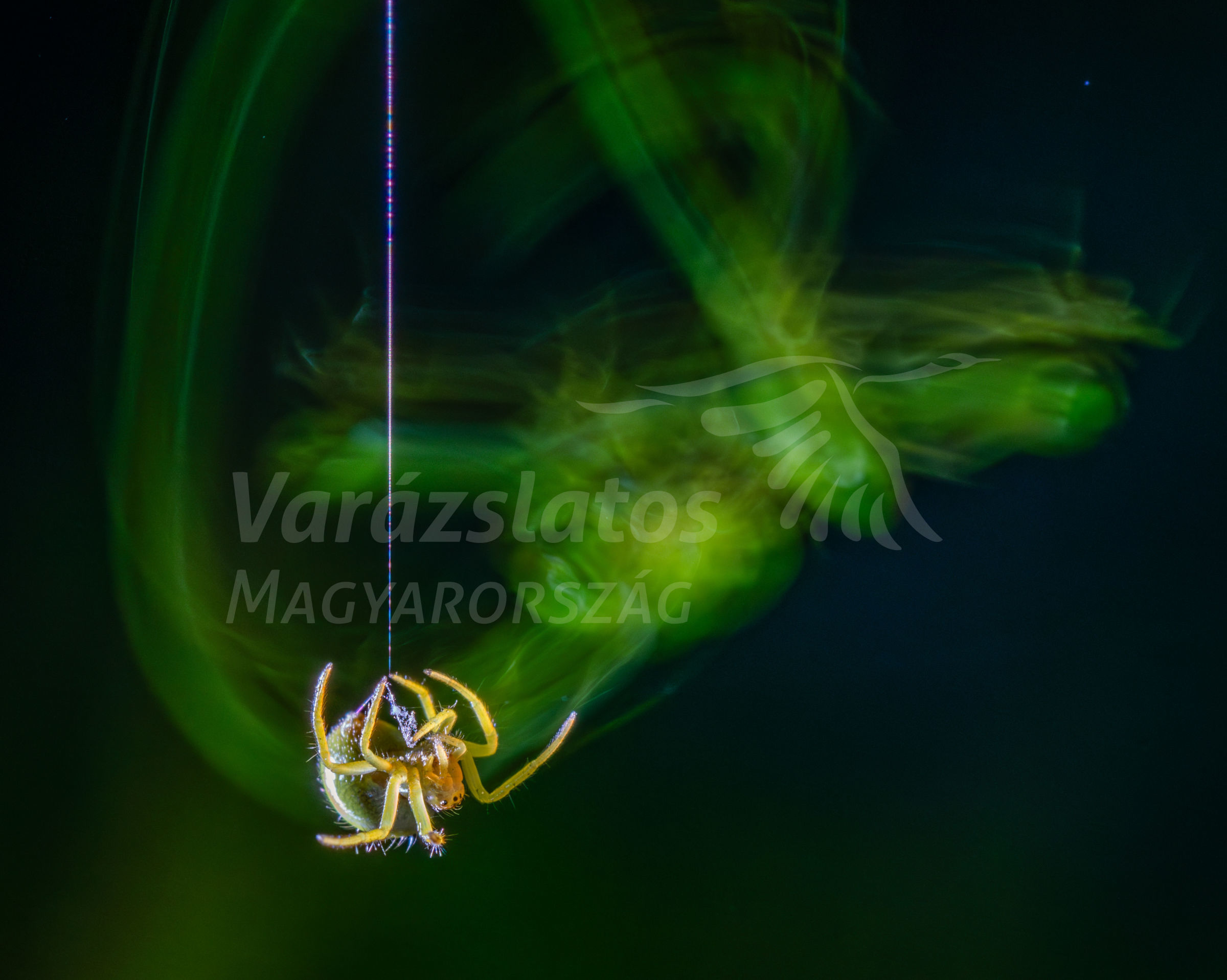 Hosszúzáridős kép egy szélben lengedező Zöld keresztespókról. Folyamatosan világítottam egy lámpával és az expozició végén vakuval fagyasztottam meg a pillanatot.