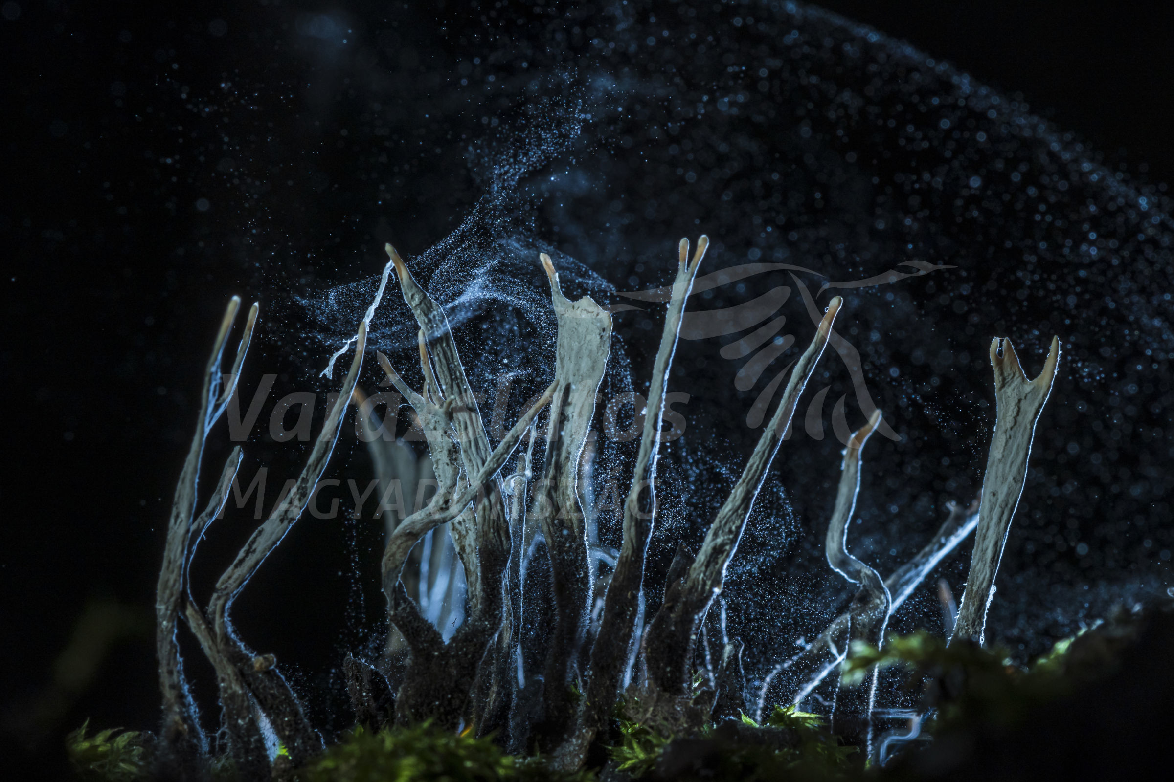 A gomba szó hallatán bizonyára legtöbbünknek a kalapos gombák jutnak eszünkbe. Azonban, ha jobban megismerjük őket, hamar rájöhetünk, hogy rendkívüli formákat képesek ölteni. A felvételen megjelelő szarvasagancsgomba alig néhány centiméteres. Rendkívüli élmény volt a makro objektíven keresztül szemlélni és szembesülni az általa engedett - lágy szellő formálta spórafelhővel.