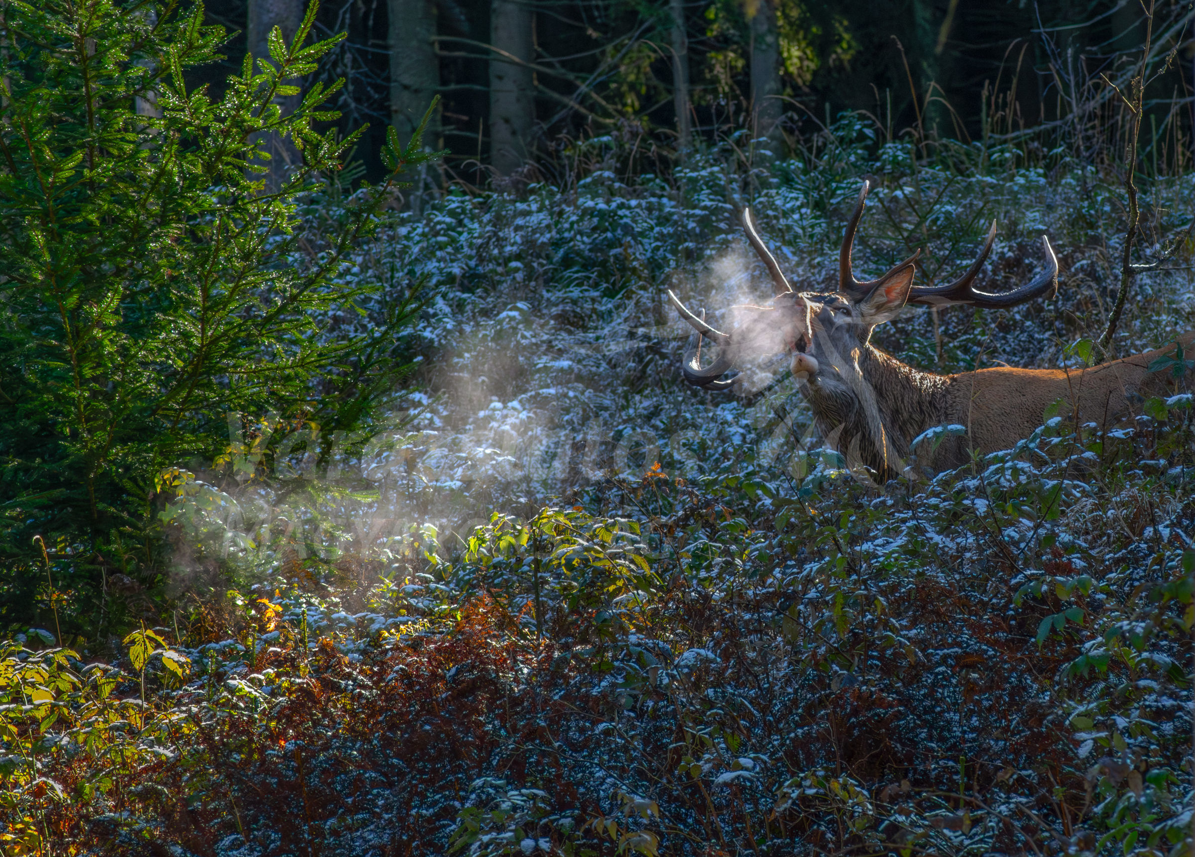 Életem eddigi legszebb szarvasbőgésekor készült a kép, ami az atmoszférát illeti. A gyergyói hegyekben voltunk, indultunk haza és egy bika megszóllalt a közeli távolban, 5 másikkal együtt. Utolsó erőnkkel bevállaltuk az utat fel gyalogoltunk a hegyre és némi takarsában a hegyi ösvényre leguggoltunk. Egyszer csak átvágott az egyik bika a vágtéren és megállt. Pár perc múlva a nap egy keskeny fénycsíkban átszűrődőtt a magas hegy felett körülbelül 80 centiméter volt fénycsík átmérője és ekkor azt gondoltam, hogy bárcsak a bika oda sétálna ehhez a fényhez. Minusz 4 fok volt és egy kis hó is esett aznap reggelre. Csodálatos módon a bika egyszercsak elindult és a legjobb helyen megállva elkezdett bőgni és a párán megcsillant a napfény.