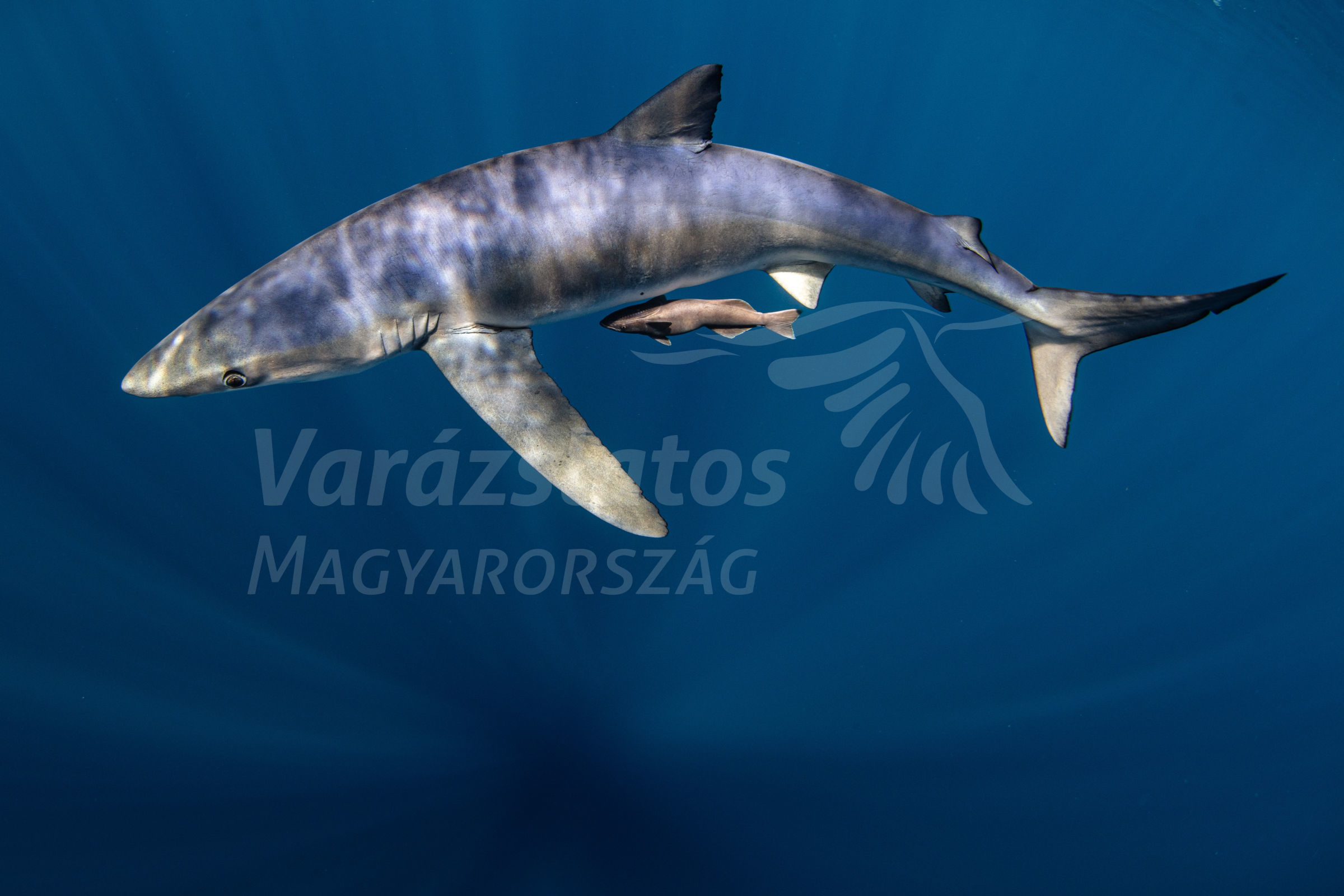 Ezt a fotót februárban készítettem első baja californiai utam során. A kékcápák fotózása mindig különleges élmény számomra — rendkívül kíváncsiak, gyakran túl közel is jönnek, ami szinte bensőségessé teszi a találkozást. Télen ezek a cápák a melegebb áramlatok és a bőséges táplálék miatt húzódnak Baja partjaitól távolabbra. Szerencsém volt: ez az elegáns példány nyugodtan körözött körülöttünk a nyílt óceánban, oldalán egy remorával – tökéletes körülmények között örökíthettem meg.